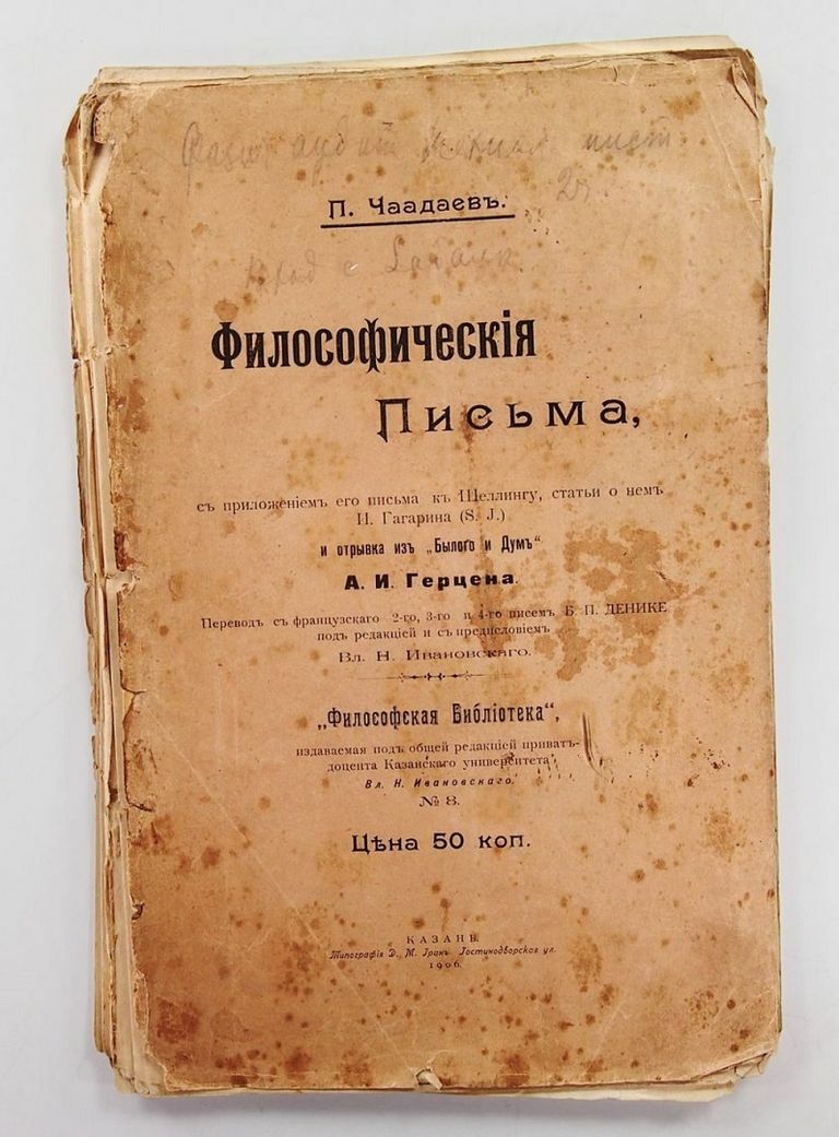 На формирование западнической и славянофильской идеологии значительное влияние оказал П. Я. Чаадаев, публицист и мыслитель. В «Философических письмах» он говорил об «отлучённости» России от всемирной истории, «духовном застое» в России и «национальном самодовольстве», которые препятствуют её историческому развитию. За публикацию своего письма в журнале «Телескоп» (1836) он был объявлен сумасшедшим, а сам журнал закрыт. В «Апологии сумасшедшего» Чаадаев выразил веру в будущность обновлённой России, включённой в западный христианский мир.