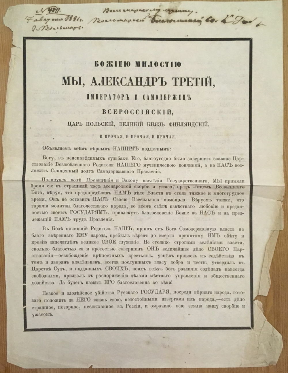 1881 г. — «Положение о мерах к охранению государственного порядка и общественного спокойствия»: министр внутренних дел и генерал-губернаторы могли объявить любой район страны на «исключительном положении» (власти получали право внесудебного преследования, закрытия учебных заведений, органов печати, могли приостанавливать деятельность земств).