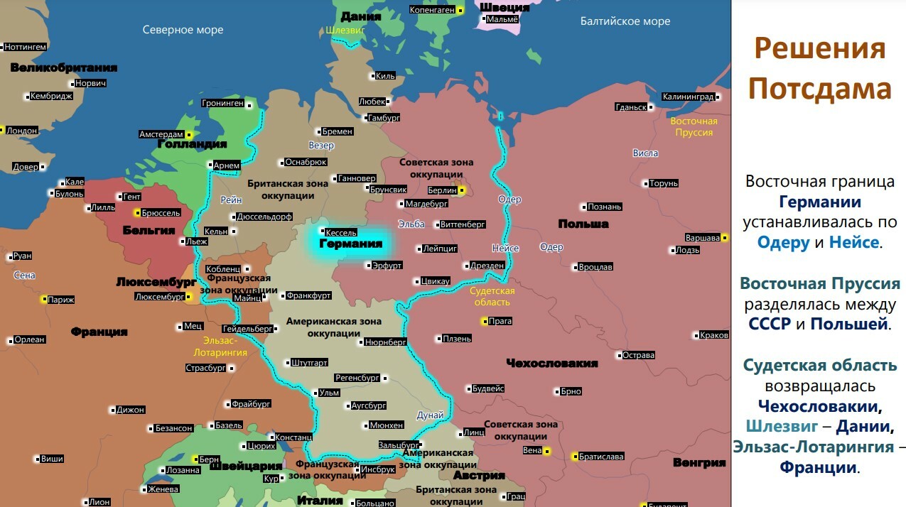 • На конференции установили новые границы в Европе. Были признаны довоенные границы СССР, а территория Польши расширена за счёт германских земель. Между Польшей и СССР была поделена территория Восточной Пруссии (столица — Кёнигсберг, переименованный в Калининград).