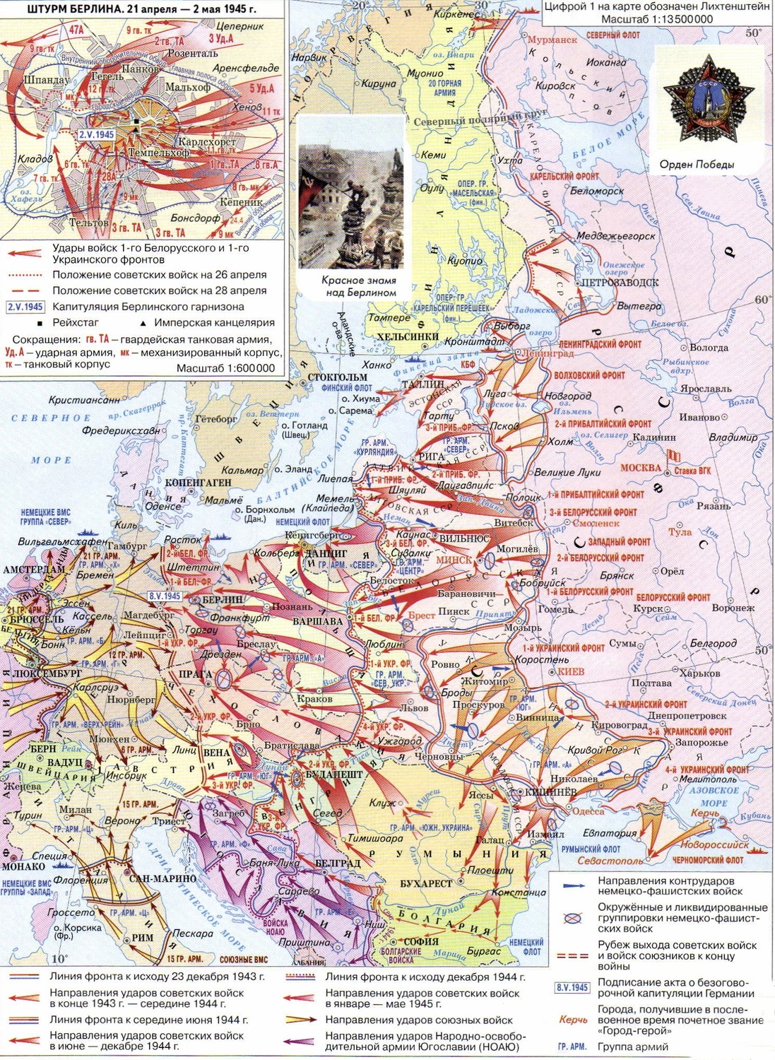 операция Оверлорд - английские и американские войска высадились на побережье Нормандии, открыв Второй фронт. 15 августа союзники высадились в Южной Франции.Командующие: Д. Эйзенхауэр, Б. Монтгомери