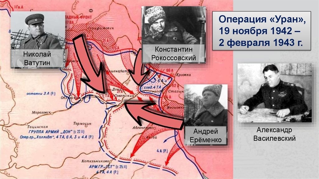- Наступлением руководили: Юго-Западного фронта - генерал Н.Ф. Ватутин, Донского - генерал К.К. Рокоссовский и Сталинградского - генерал А.И. Ерёменко)